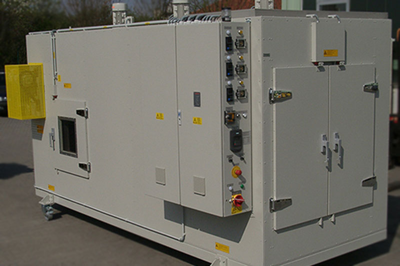 Dieser Umluft-Frischluftofen wird zum Polymerisieren von lösungsmittelfreiem Silikonkleber sowie zum Ausheizen von Silikon-Vergussmaterialien und Epoxydharzen bei der Herstellung von Leistungshalbleiter verwendet.