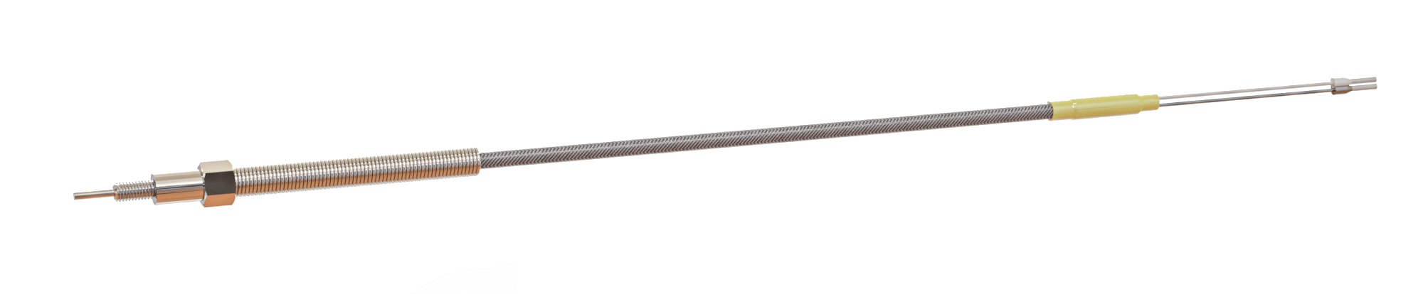 Einschraubthermoelemente eignen sich sehr gut zur Messung an Oberflächen. Sie werden direkt in das Werkstück eingeschraubt und sind in verschiedenen Gewindegrößen erhältlich. Durch den kleinen Fühlerdurchmesser des Temperatursensors Typ TEF 3 hat dieser eine schnelle Ansprechzeit. Der TEF 3 besitzt eine 10er Schlüsselweite, dadurch ist ein problemloses Einschrauben in das Werkstück möglich. Der Übergang vom Fühlerteil zur Ausgleichsleitung ist konisch zugentlastet. Als Knickschutz wird eine Feder Ø 8 x 65 mm verwendet.